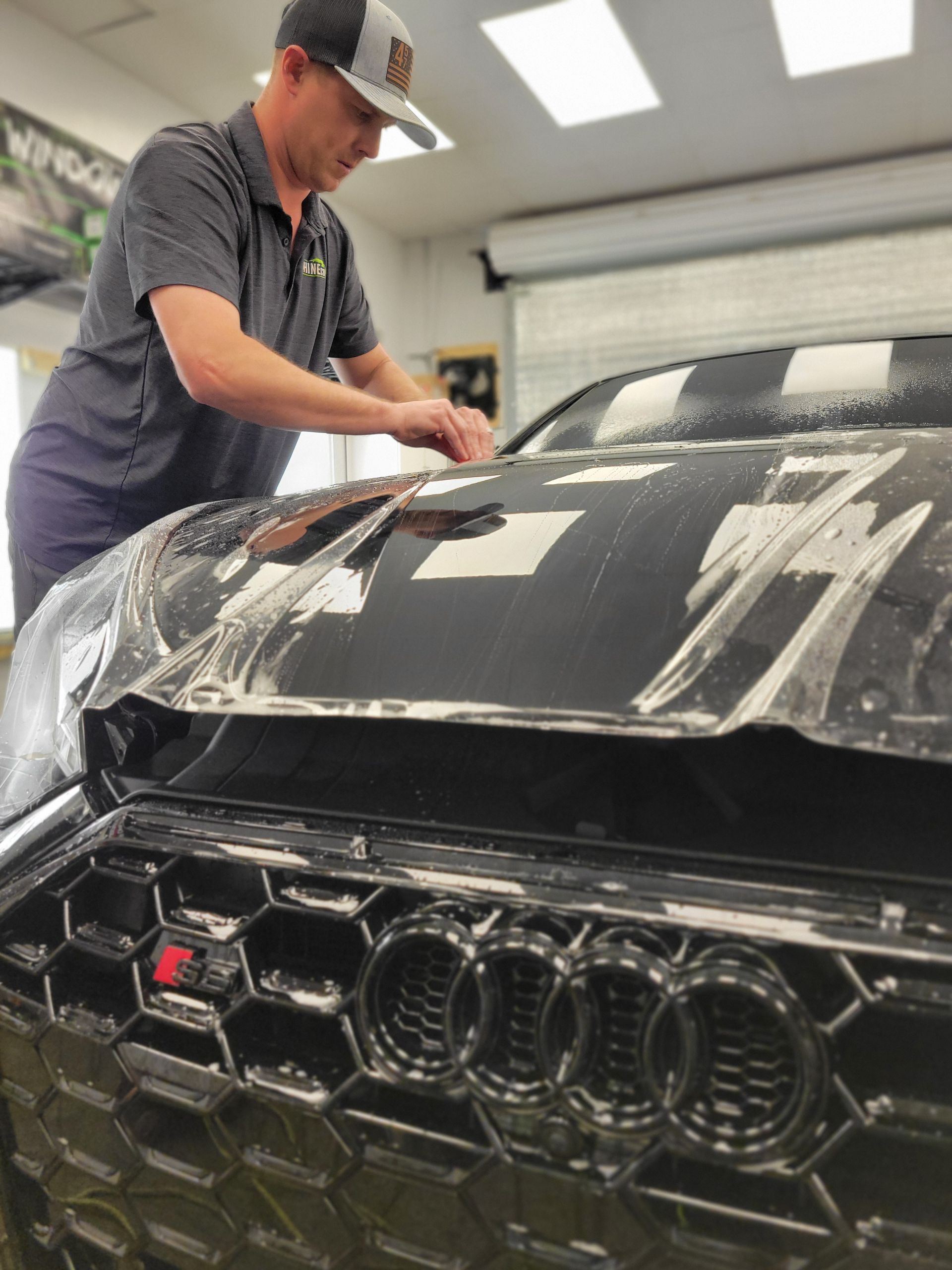 We start by fully decontaminating the vehicle’s exterior using professional clay bars and cleaning products. This step ensures the film bonds correctly without trapping debris underneath.